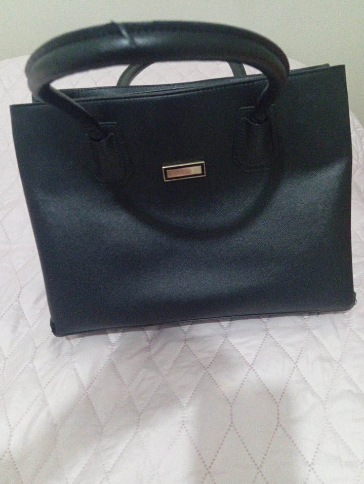 Parlak siyah deri, tokalı, modern klasik tarzda kadın ofis çantası.