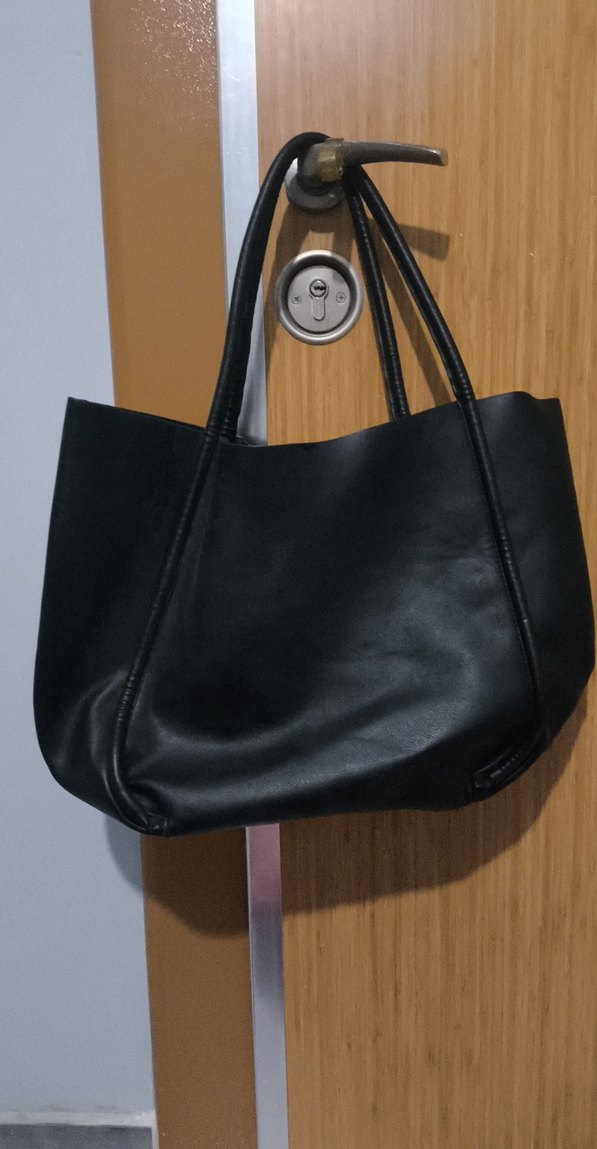 Siyah deri kadın omuz çantası, büyük boy ve tokalı detaylara sahip. Günlük kullanıma ve trend rahat stillere uygundur. yurtdışından alındı, çok az kullanıldı.