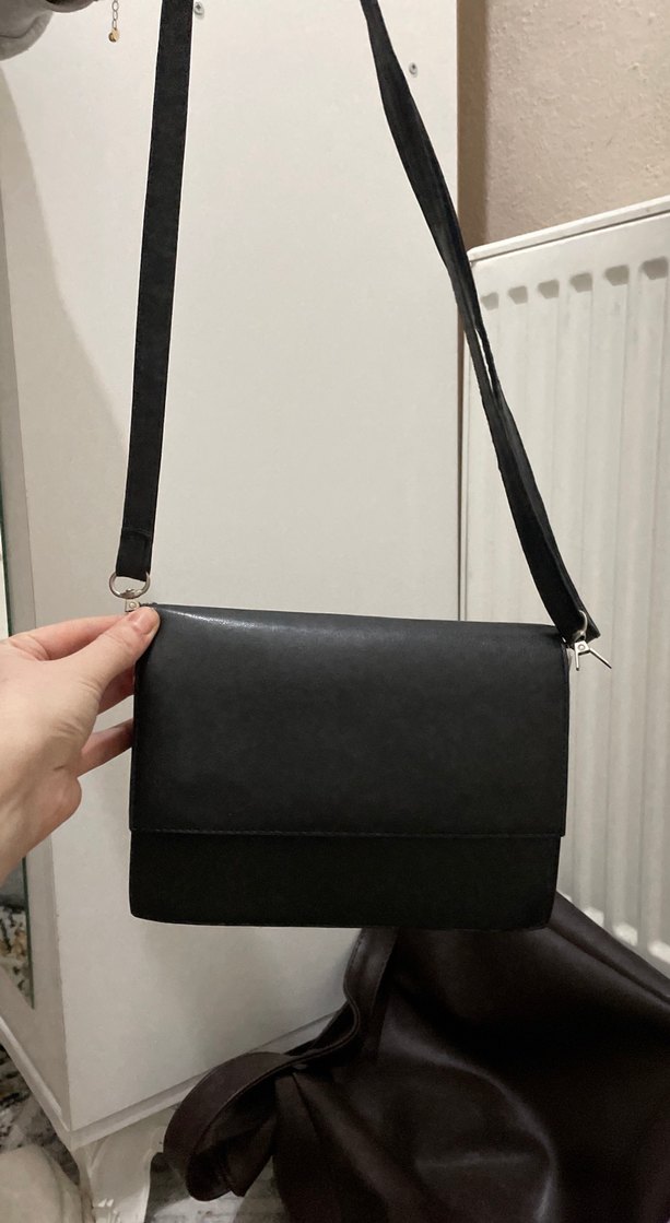 Siyah deri, tokalı kapaklı kadın omuz çantası. Minimalist ve gotik tarzda, günlük kullanıma uygun, desensiz sade tasarım.