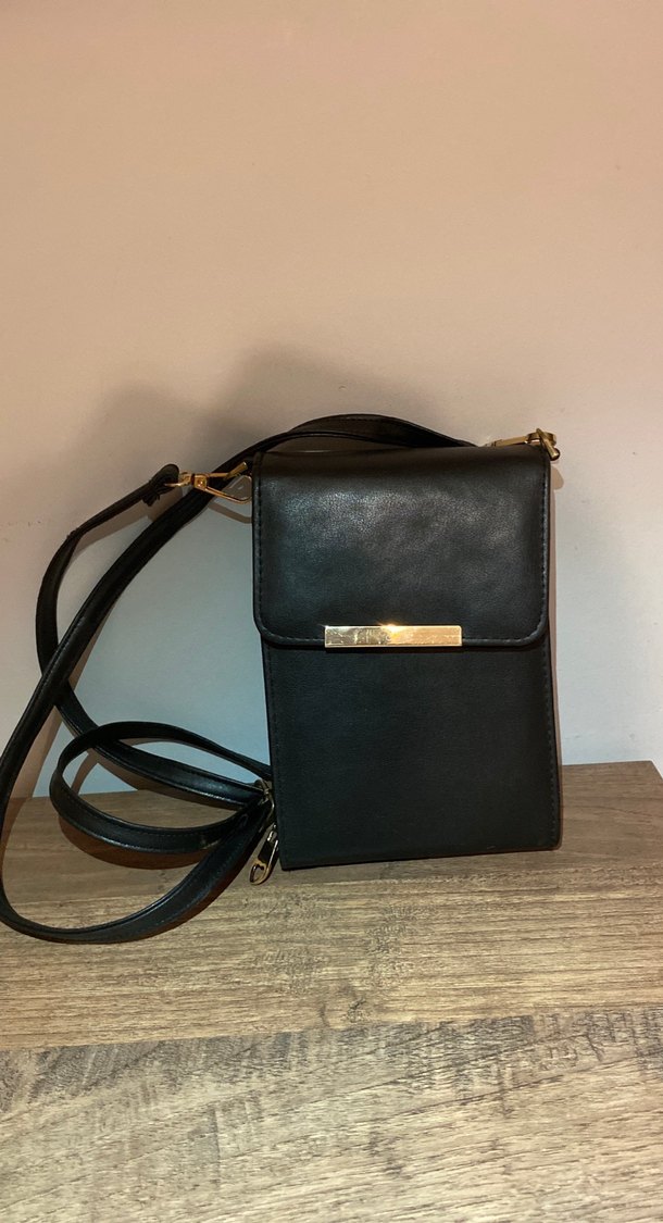 Siyah deri, tokalı kadın omuz çantası. Günlük kullanım için uygun, minimal ve desensiz, sokak stiline uyumlu.