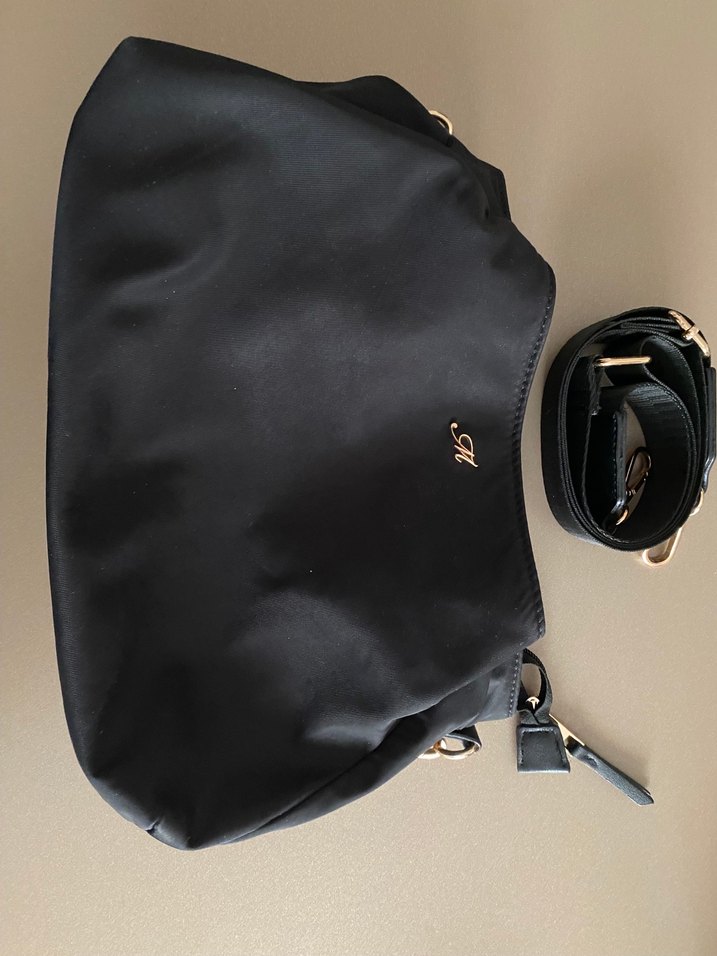 Siyah deri kadın çanta, tokalı askı ve minimal desenle günlük kullanıma uygun klasik şıklık sunar.