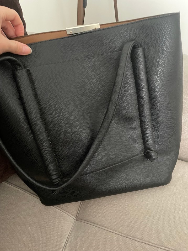 Siyah deri kadına özel, tokalı detaylara sahip, günlük sokak stili ve iş hayatına uygun omuz çantası.