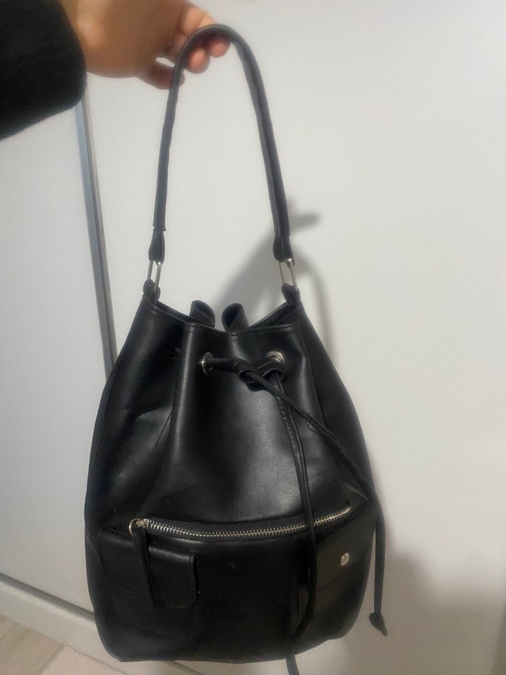 Siyah deri kadın omuz çantası, tokalı bağlama detayı ve ön fermuarlı cep ile günlük rahat stil için uygundur.