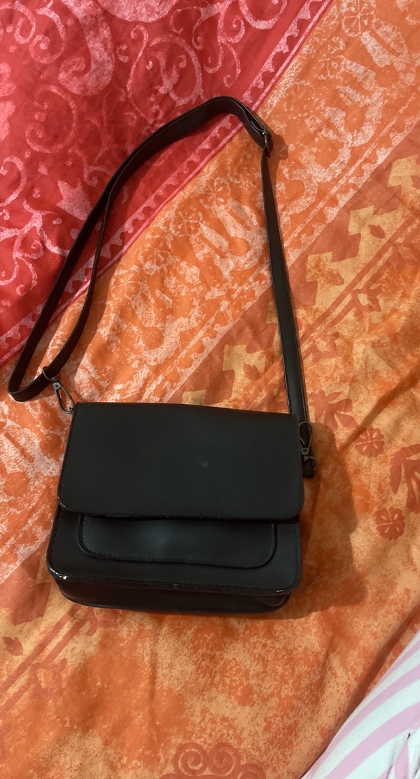 Siyah deri, tokalı kapak ve ayarlanabilir askıya sahip, minimalist gotik tarzda günlük kullanıma uygun kadın omuz çantası.