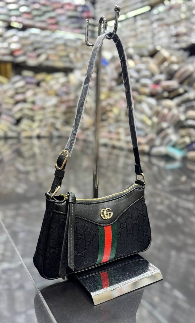 Siyah deri kadın omuz çantası, baskılı desen ve tokalı askı ile. Fermuarlı kapanış ve şerit detay içerir, günlük kullanım için uygundur.