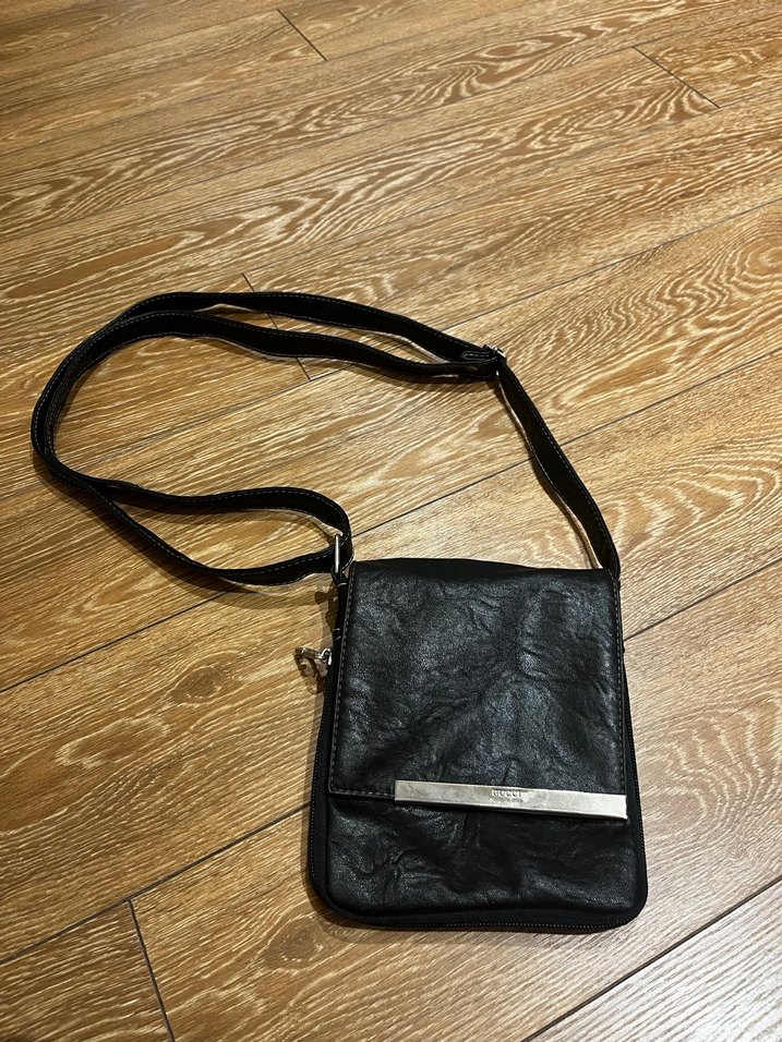 Siyah deri, kemerli detaylı, ayarlanabilir askılı kadın omuz çantası. Desensiz ve günlük kullanım için uygun. Orijinal GUCCİ