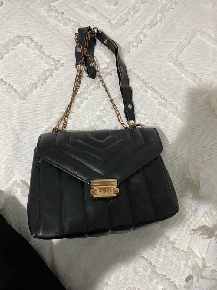 Klasik şıklıkta, tokalı kapak ve zincir askılı siyah deri kadın çantası, hafif yılan derisi desenli. Günlük kullanıma uygun.