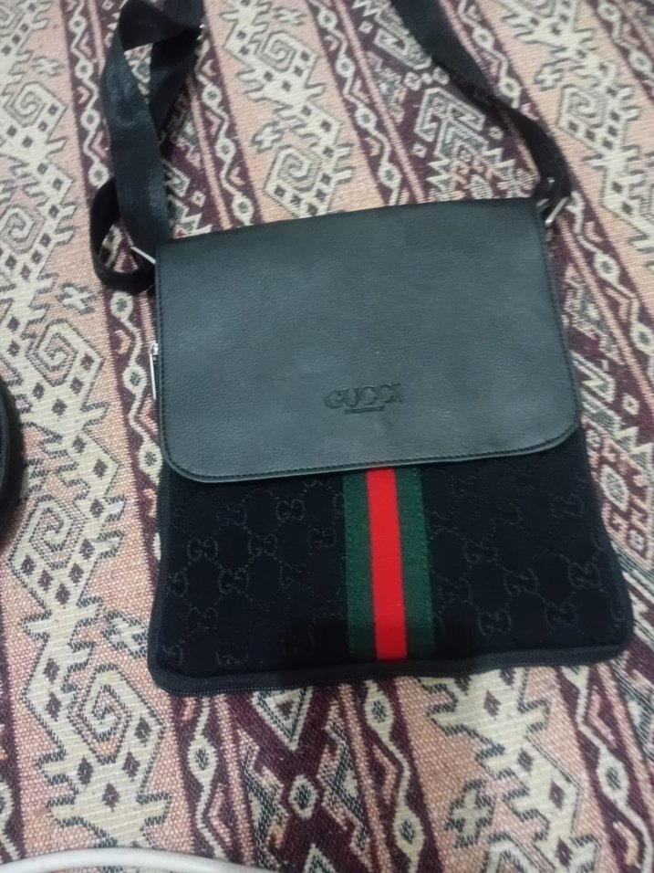 Siyah deri, tokalı kapaklı, kırmızı ve yeşil ince şerit detaylı minimalist, desen içermeyen kadın omuz çantası, günlük kullanım için uygun.