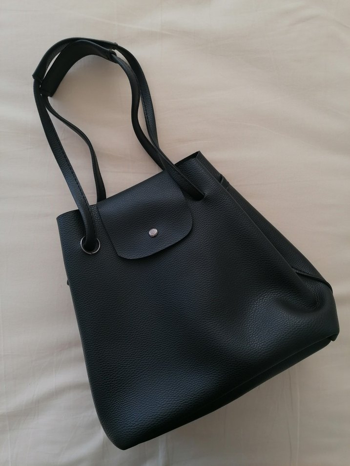 Siyah deri, tokalı kapaklı kadın omuz çantası. Minimalist ve günlük sokak stili için uygundur.