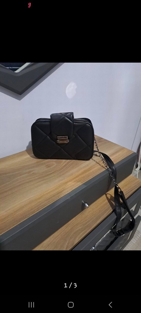 Siyah deri omuz çantası, tokalı kapak ve zincir askıya sahiptir. Günlük kullanıma uygun, desen içermeyen şık bir tasarıma sahiptir.