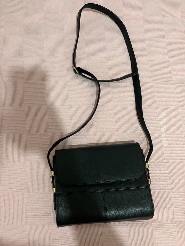 Demir kısmlarında hafif renk solması var başka bir sorunu yok Siyah deri, tokalı askılı kadın omuz çantası. Minimalist ve sokak tarzı, günlük kullanıma uygun. Trendy casual görünüm için ideal.