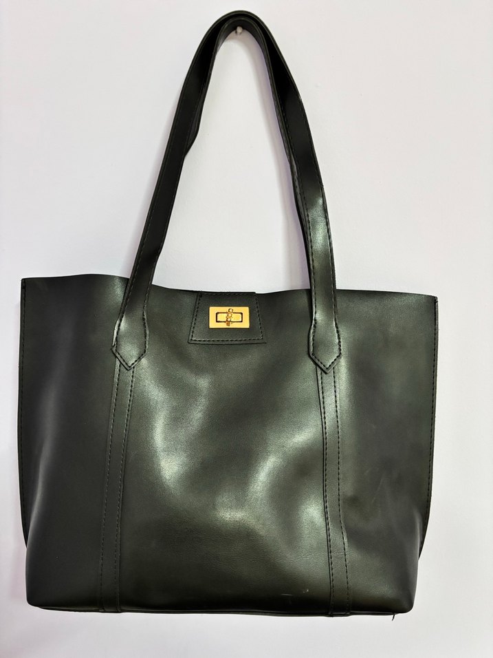 Siyah deri, tokalı kadın omuz çantası. Klasik ve çağdaş tarzda, günlük kullanım için uygundur.