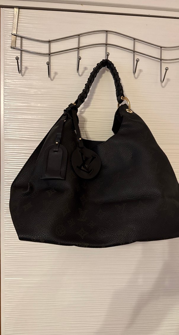 Siyah deri, baskılı desenli ve tokalı kadın omuz çantası, trend sokak stiline uygun.