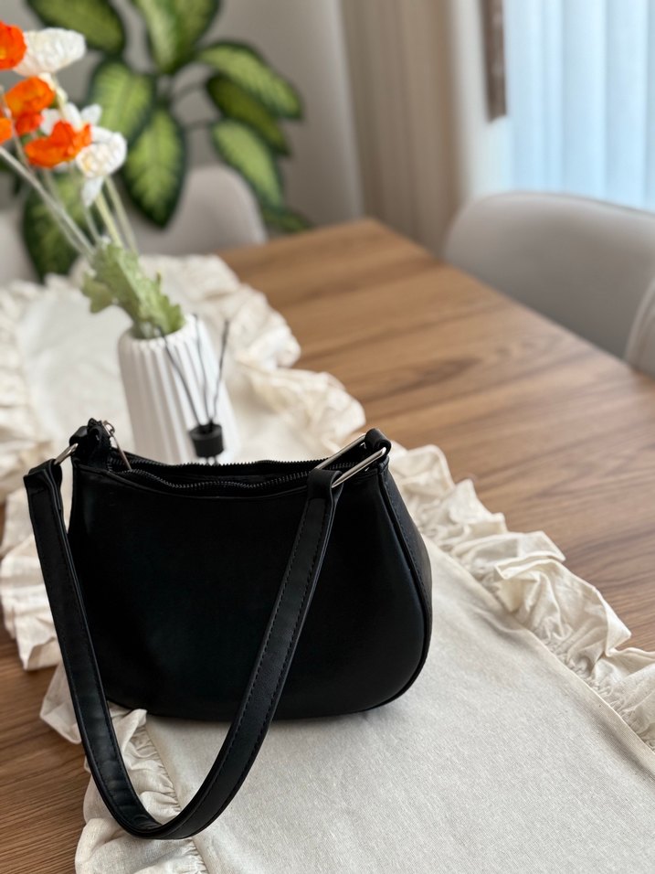 Siyah deri, tokalı askıya sahip kadın omuz çantası. Düz ve desensiz tasarımıyla günlük kullanıma uygundur.