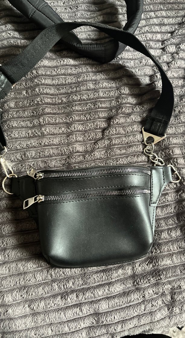 Siyah deri, tokalı kayışlı ve çift fermuarlı bölmeli kadın omuz çantası. Minimalist sokak tarzı, günlük kullanıma uygun.