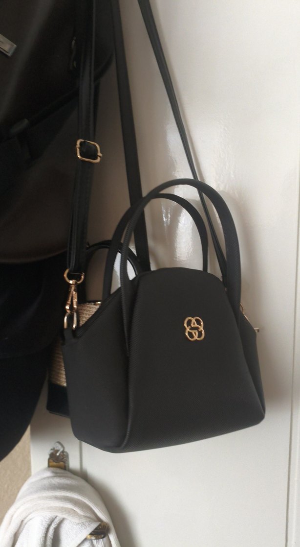 Siyah deri, parlak yüzeyli ve baskılı desene sahip, tokalı askılı kadın çantası. Günlük sokak stiline klasik zarafet katıyor.