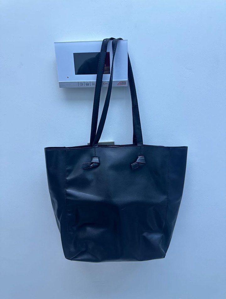 Siyah deri, tokalı askılara sahip kadın omuz çantası. Minimalist ve desensiz tasarımıyla günlük ve sokak stiline uygun.