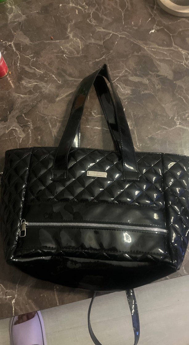 Siyah deri kadın çantası, fermuarlı ön cep ve kapitone detaylı, günlük kullanıma uygun trendy gotik tarzda.