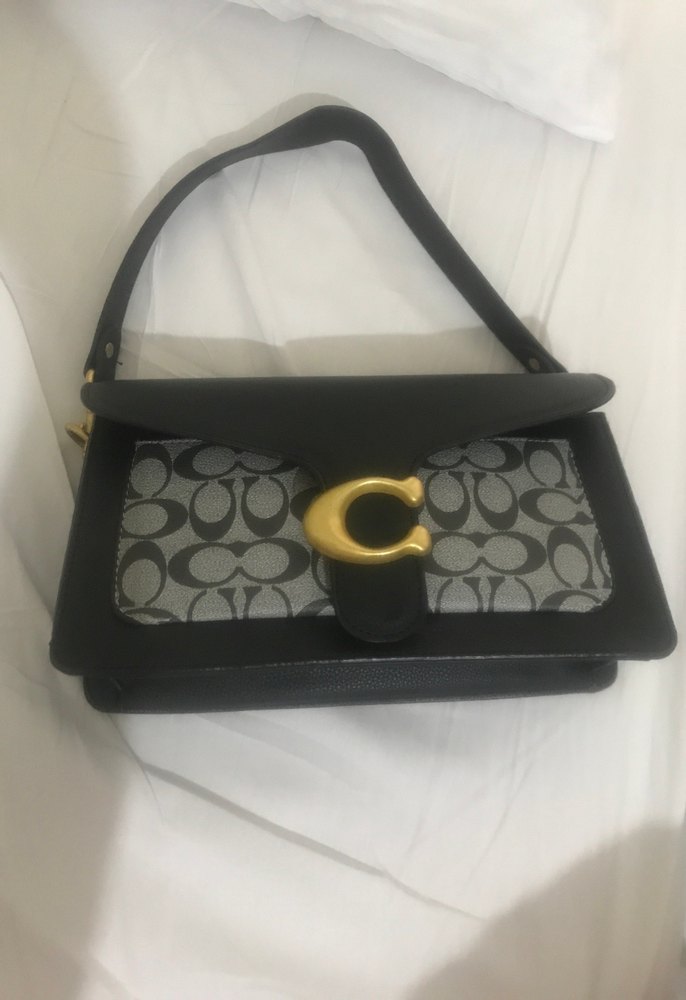 Siyah deri malzemeden yapılmış, baskılı desene ve belirgin altın tokaya sahip kadın omuz çantası. Klasik zarafet ve çağdaş stili bir araya getirir.