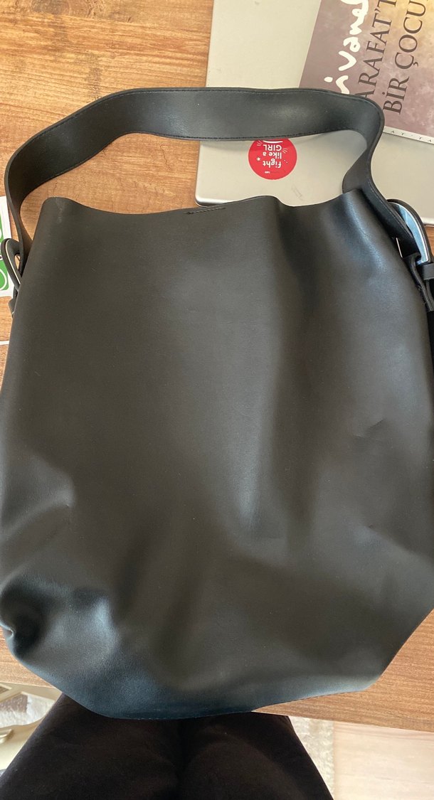 Siyah deri kadın omuz çantası, tokalı askısı ve sade tasarımıyla günlük kullanıma uygundur. Hiçbir defosu yok bilgisayar defter rahatlıkla sığıyor