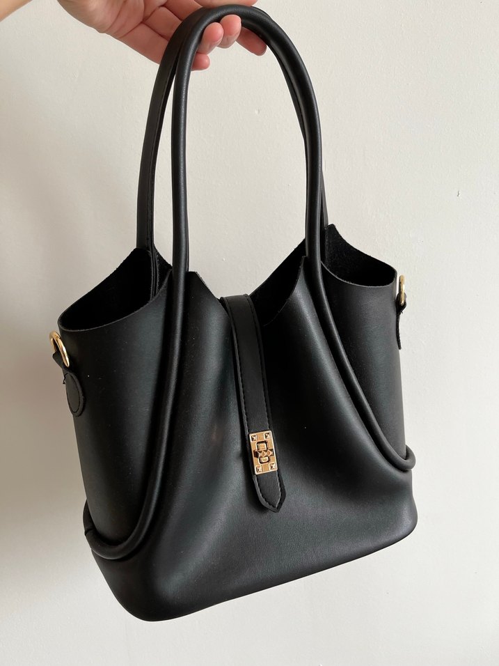 Siyah deri omuz çantası, tokalı kayış ve modern klasik tasarıma sahiptir. Düz yüzeyi ve şık Paris tarzıyla günlük kullanıma uygundur.