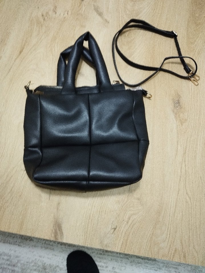 Tokalı detaylara sahip siyah deri kadın çantası, kulplu ve çıkarılabilir askılı.