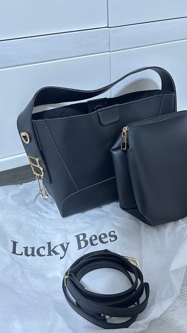 Siyah deri, tokalı askılı kadın omuz çantası. Minimalist, günlük sokak stiline uygun. Çıkarılabilir küçük çanta ve Lucky Bees marka toz torbası içerir. Hiç kullanılmadı
