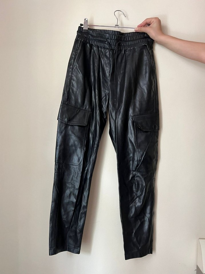 Siyah deri, kemerli ve bol kesim kadın pantolon. Street tarzında midi boy, cep detaylı ve desen içermeyen günlük kullanıma uygun pantolon.