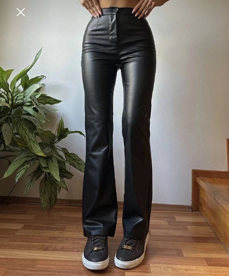 Düğmeli kapama, regular fit ve midi boyda siyah deri pantolon.