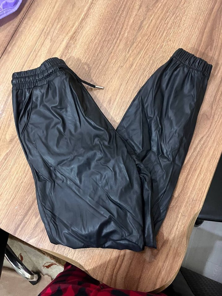 Sokak modası ve athleisure tarzı için kemerli, bol kesim siyah deri pantolon. Uzun boy ve desensiz, dış mekan rahatlığı için uygundur.