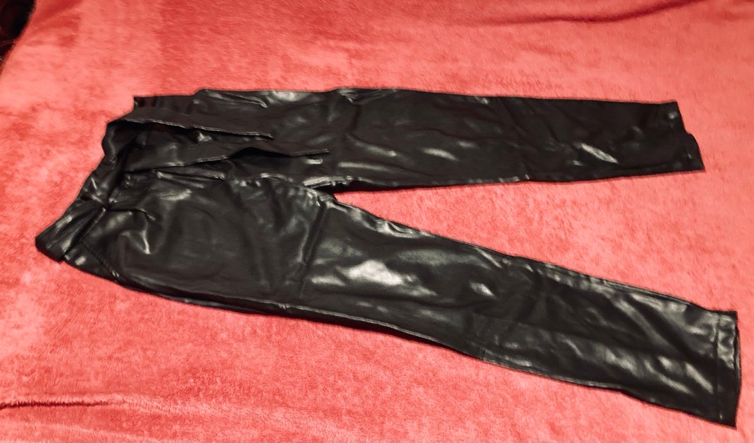 Siyah deri pantolon, fermuarlı detaylara, gotik tarzda günlük kullanım için uygun.