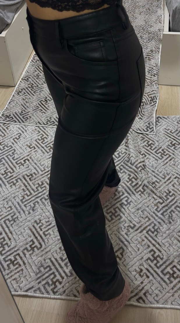 Siyah deri ve normal boyda, günlük kullanıma uygun straight kesim kadın pantolonu.