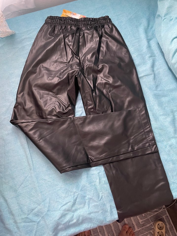 Siyah deri, kemerli, regular fit kadın pantolon. Düz, midi boy, sokak stiline uygun, günlük kullanım için ideal.