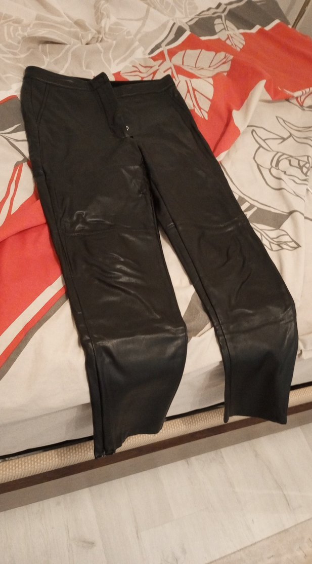 Siyah, fermuarlı detaylara sahip, deri biker tarzı, normal boy midi uzunluğunda kadın pantolon. İçi peluş,bilekleri fermuarlıdır.Kusurları vardır oyüzden fiyatı düşük tuttum.