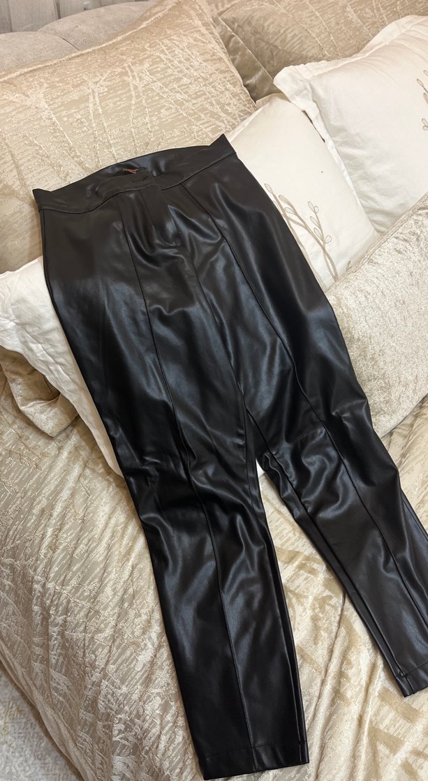 Kemerli, uzun siyah deri pantolonlar, gotik Paris tarzı için uygun şık ve düz tasarıma sahiptir. Günlük kullanım için idealdir.