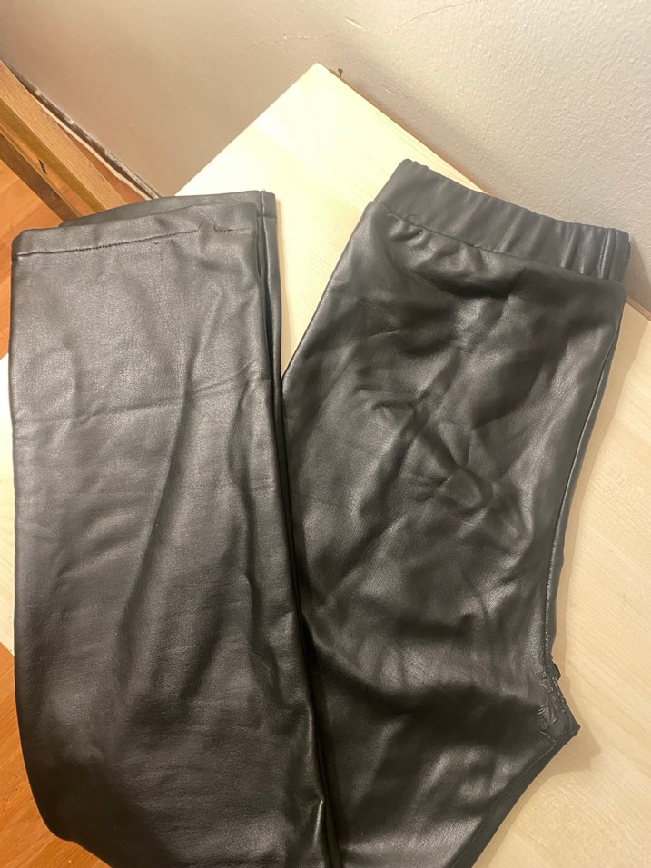 Siyah deri, midi boy, dar kesim kadın pantolon. Desensiz, sokak stiline uygun, zahmetsiz şıklık sunar. Ağ kısmında küçük soyuIma var