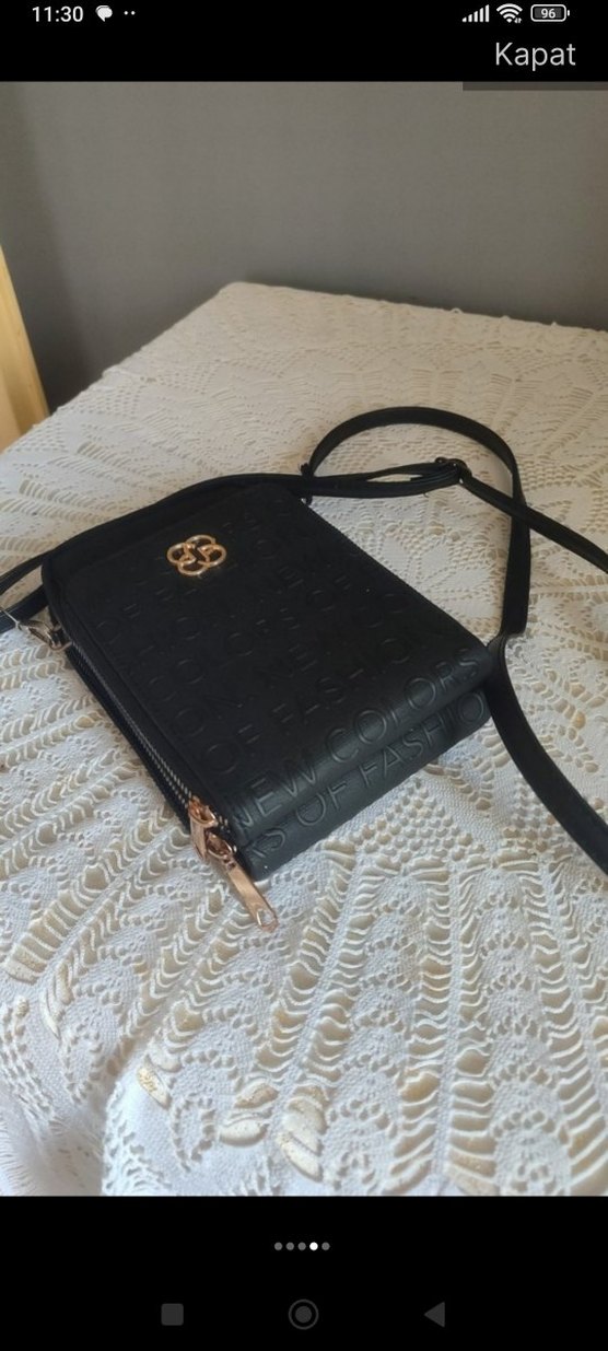 Siyah deri postacı çantası, baskılı deseni ve fermuarlı kapanışı ile günlük kullanım için klasik Paris sokak stilini yansıtıyor.