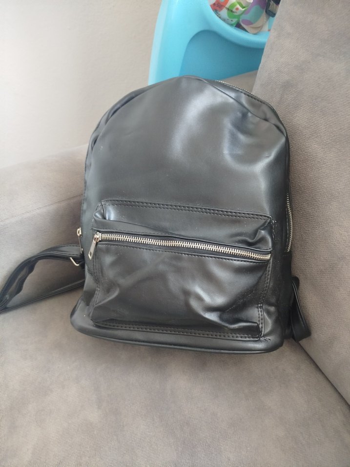 siyah tonlarda deri kadın sırt çantası, fermuarlı ön cepli, günlük kullanıma uygun minimalist sokak stiliyle uyumlu.