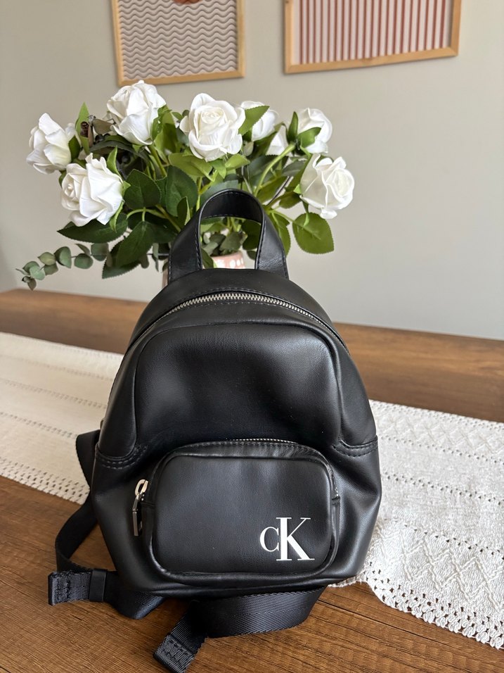 Siyah deri sırt çantası, ön fermuarlı cepli ve CK logosu ile minimalist tasarıma sahiptir. Tokalı askıları vardır, trend günlük sokak stili için uygundur. Onunde ufak bir soyulma olmus dolapta durmaktan