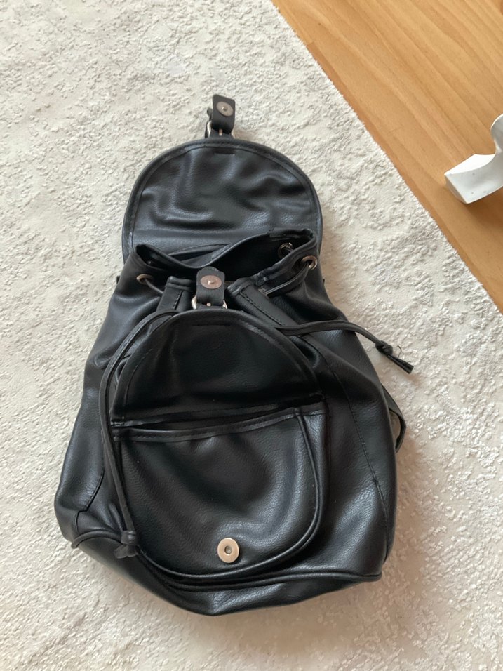 Siyah deri sırt çantası, tokalı kapakları ve minimalist gotik tarzıyla günlük kullanıma uygun, trend rahat bir görünüme sahiptir. Derisi kusursuzdur hiçbir yırtığı yoktur. İç kesimde astarı yırtılmış ama tamir edilebilir. Aynı zamanda ön taraftaki mıknatıs kısmında çıkık var. Yüzde yüz gerçek deridir.