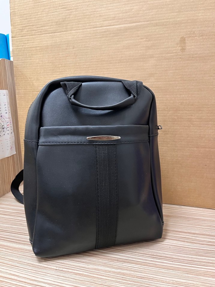 Siyah deri kadın sırt çantası, minimal, düz tasarıma sahip, parlak görünümlü ve tokalıdır, günlük kullanım için uygundur.
