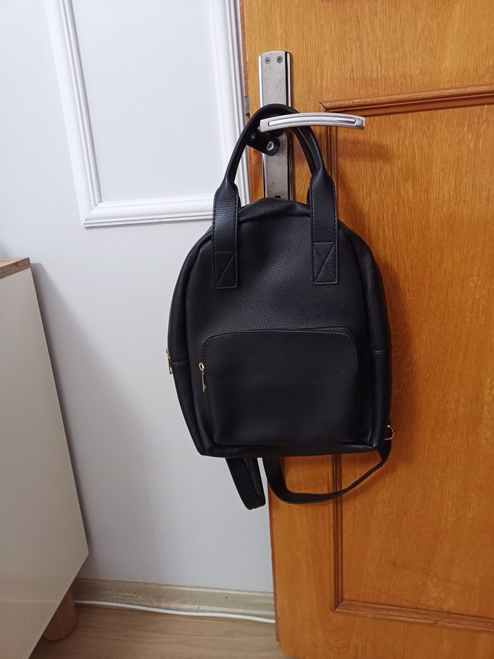 Siyah deri, tokalı kadın sırt çantası. Minimalist, desensiz tasarımıyla günlük kullanım için uygun, gotik tarzda.