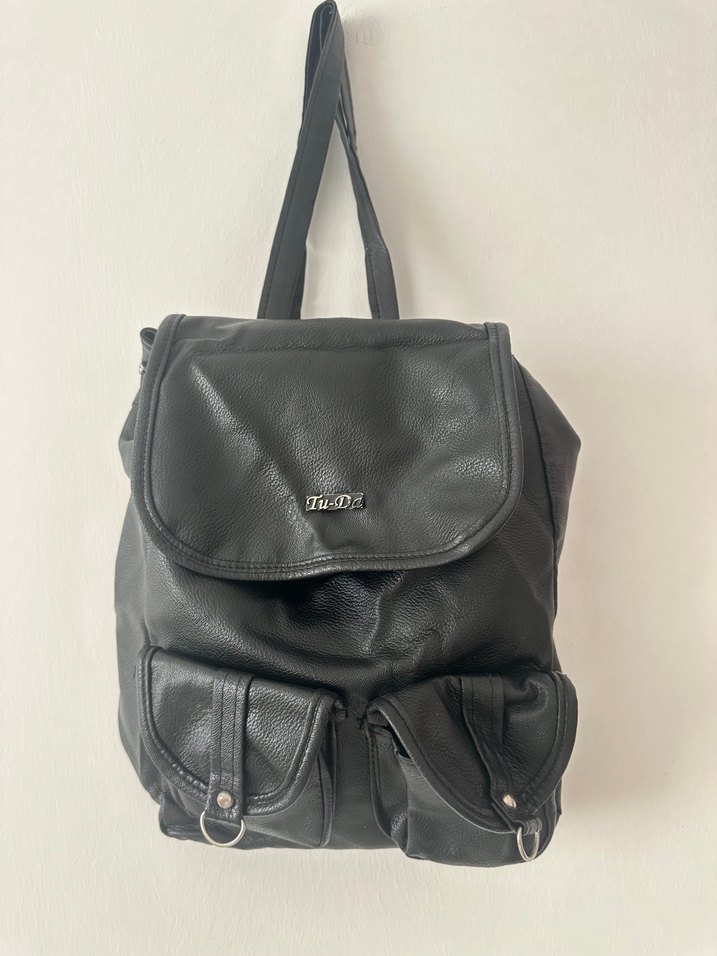 Siyah deri sırt çantası, tokalı cepleriyle günlük rahat sokak stiline uygun. Kapaklı ve çok bölmeli tasarıma sahiptir.