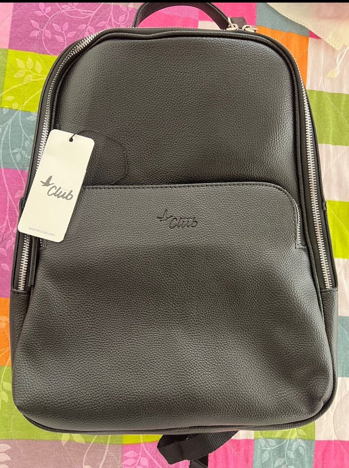 Club markalı siyah kadın sırt çantası, fermuarlı ana bölme ve baskılı detaylara sahip, günlük ve iş kullanımı için uygun.