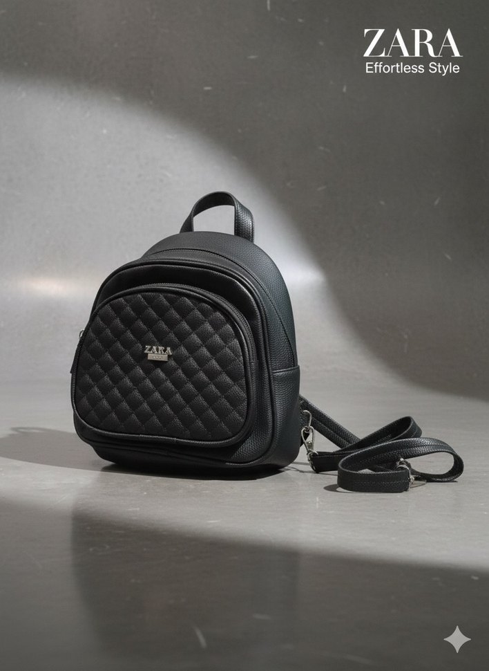 Zara'dan siyah deri sırt çantası, kapitone ön cepli ve tokalı tasarımıyla minimalist ve sokak stilini birleştirir. Günlük kullanıma uygun, klasik ve şık bir görünüm sunar.