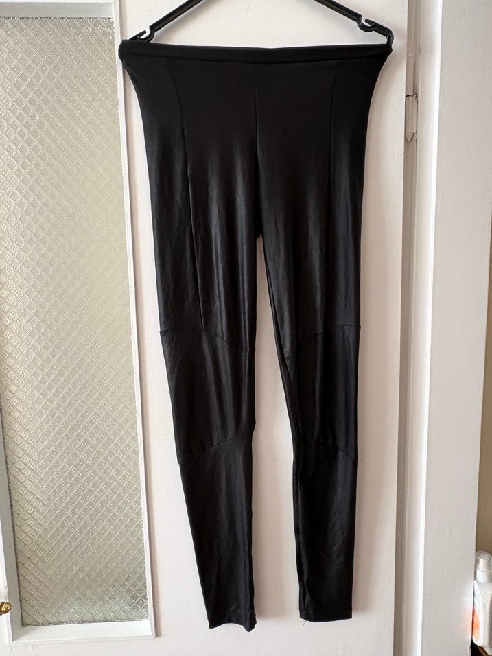 Siyah deri, vücuda oturan taytlar. şık tasarımıyla günlük kullanıma uygundur. Esnek kumaş S veya m bedene uygun.
