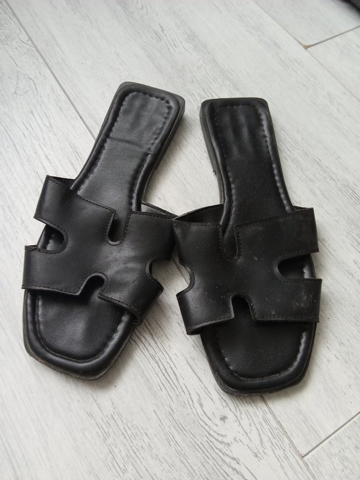 Siyah deri kadın terlik, tokalı ve blok topuklu. Minimalist goth tarzında, günlük kullanıma uygun ve desensiz.