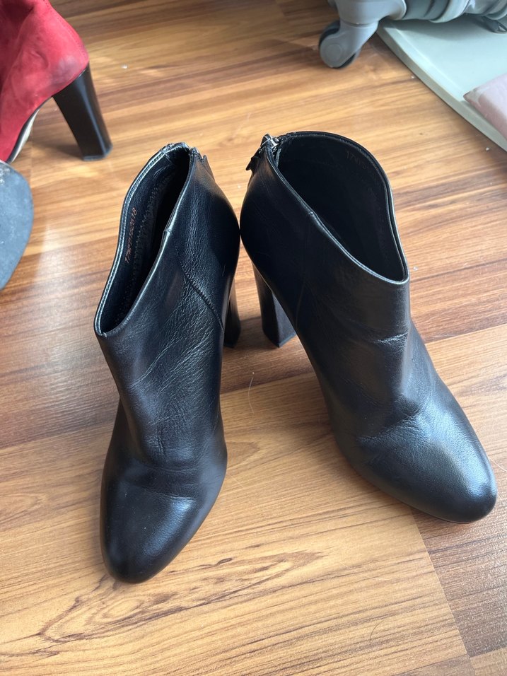 Siyah deri, tok topuklu kadın botları, fermuar detaylı. Minimalist ve cesur tarz, ofis kullanımına uygundur. Ürün 4 defa kullanıldı iade yok