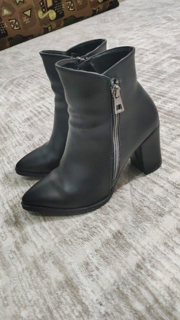 Siyah deri kadın botlar, blok topuklu ve yan fermuarlı. Minimalist gotik tarzıyla günlük kullanıma uygundur.