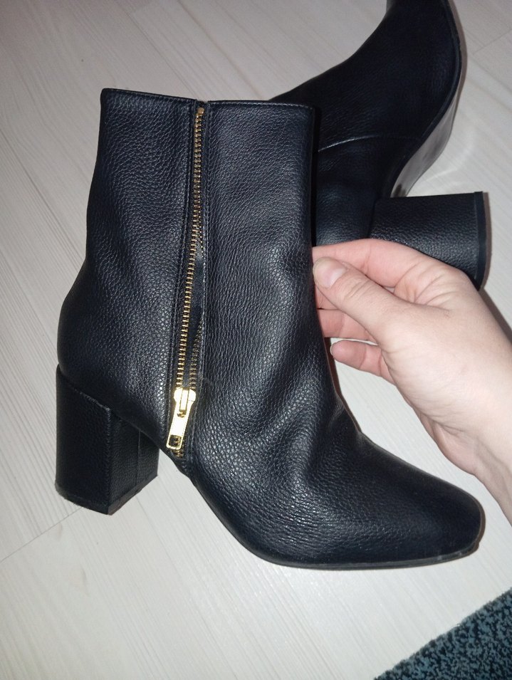 Siyah deri kadın bot, blok topuklu ve yan tarafında fermuarlı. Günlük kullanım için sade ve desensiz tasarım.